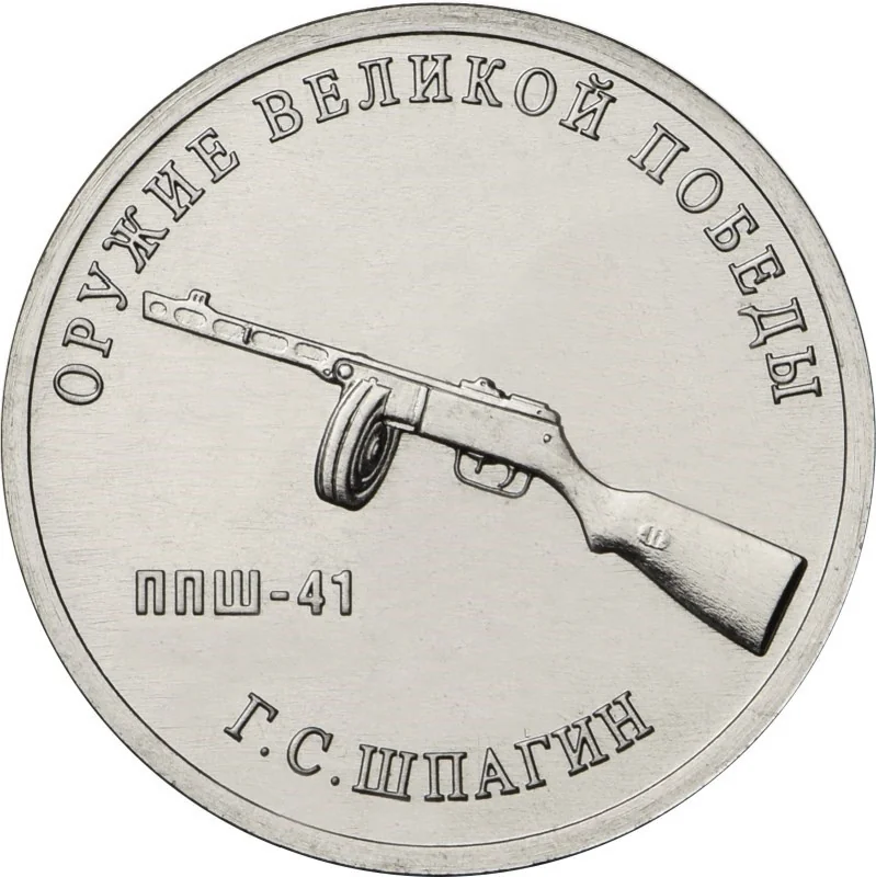 Left: A relief of the PPSh-41 submachine gun with its inscription. Around the edge: "WEAPONS OF THE GREAT VICTORY" above and "GEORGY SHPAGIN" below.