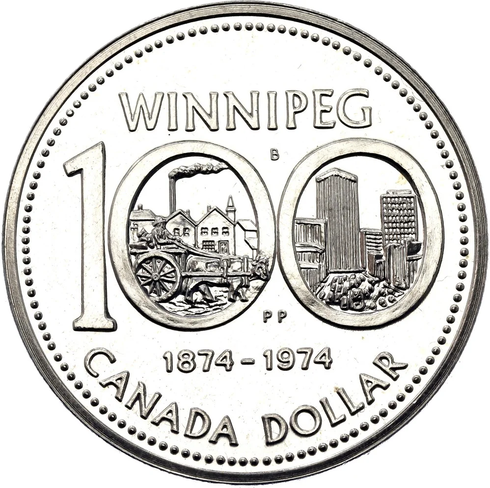 A 100-cent coin features Winnipeg's Main Street in 1874 and 1974 within its zeros, encircled by "WINNIPEG," "1874-1974," "CANADA," and the face value.