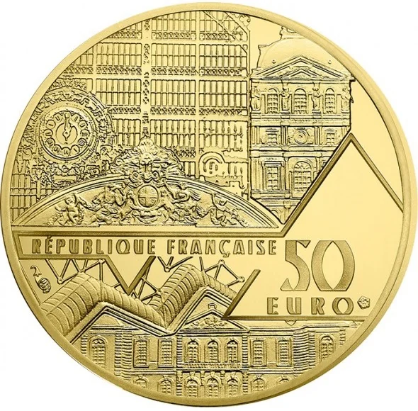 The reverse, common to the series, depicts several major French museums: the Musée d'Orsay interior (top left), the Louvre façade, the Hôtel Salé (Picasso Museum), the Hôtel Biron (Rodin Museum), and the Centre Pompidou stairway. The face value and "République Française" are also inscribed.