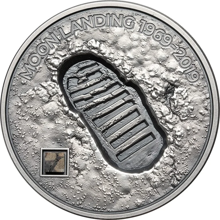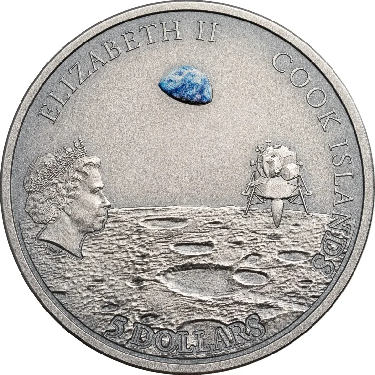 Queen Elizabeth II and the Apollo 11 lunar module, with Earth in the background.