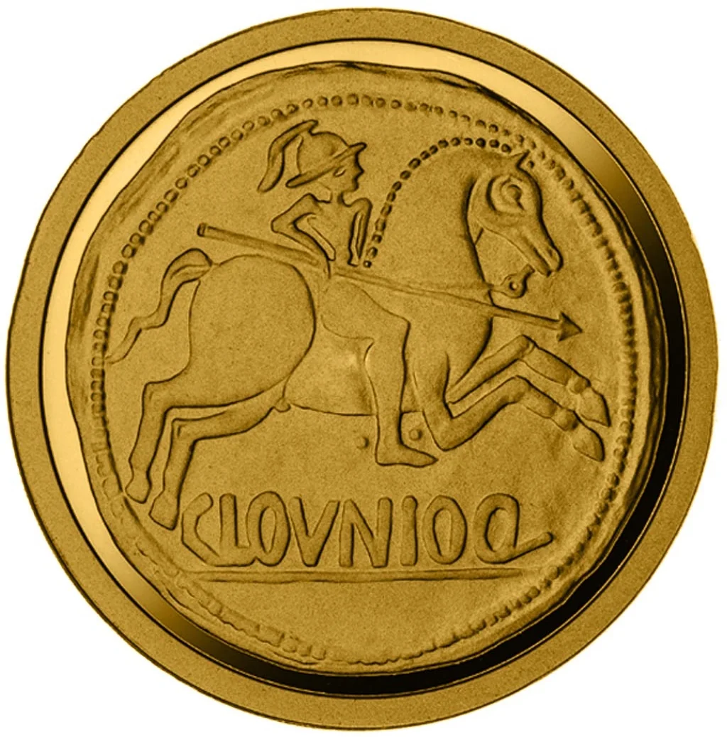 A reproduction of the Clounioq As coin, featuring an Iberian rider with helmet and lance. The horse symbolizes the prestige of the warrior aristocracy. The legend "CLOVNIOQ" indicates the mint.
