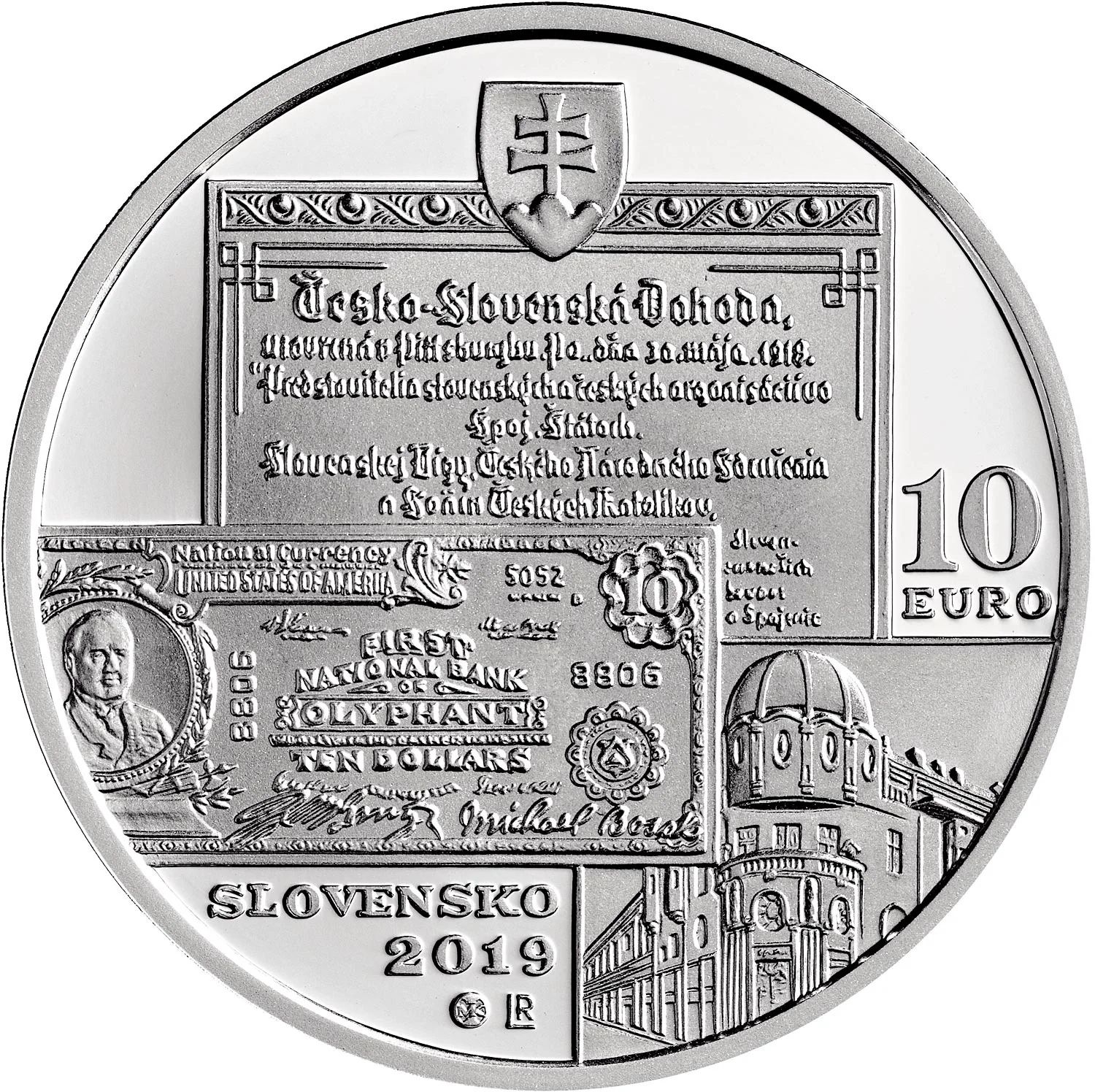 The obverse features a Michal Bosák 10-dollar banknote, details from the Pittsburgh Agreement and Bosák's House in Prešov, the Slovak coat of arms, "SLOVENSKO" and "2019", the "10" and "euro" denomination, the Kremnica Mint mark, and designer Roman Lugár's initials "RL".