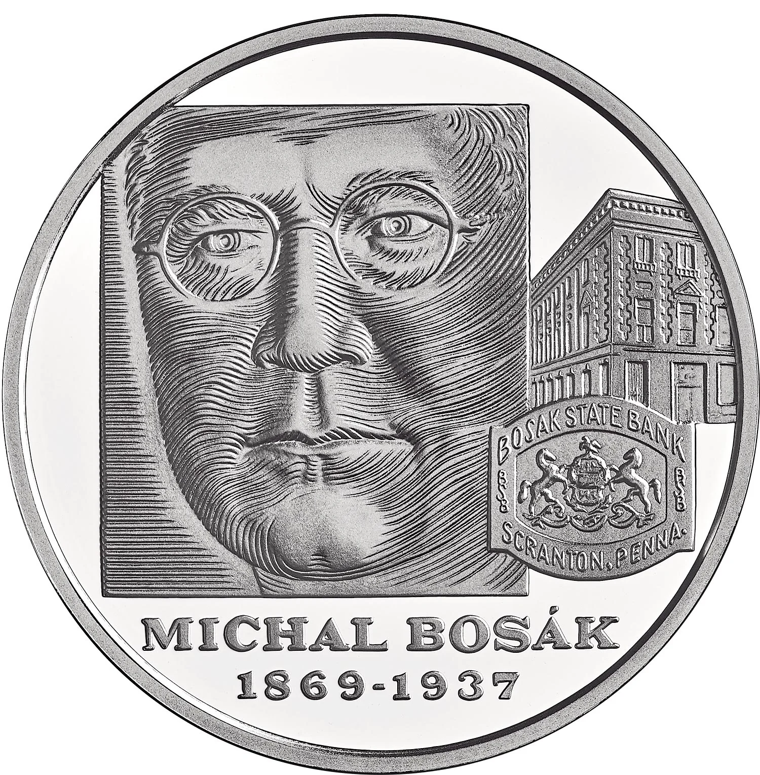 The reverse features a portrait of Michal Bosák alongside the Bosák State Bank building in Scranton and its logo. Below are his name and dates, "MICHAL BOSÁK / 1869 – 1937".