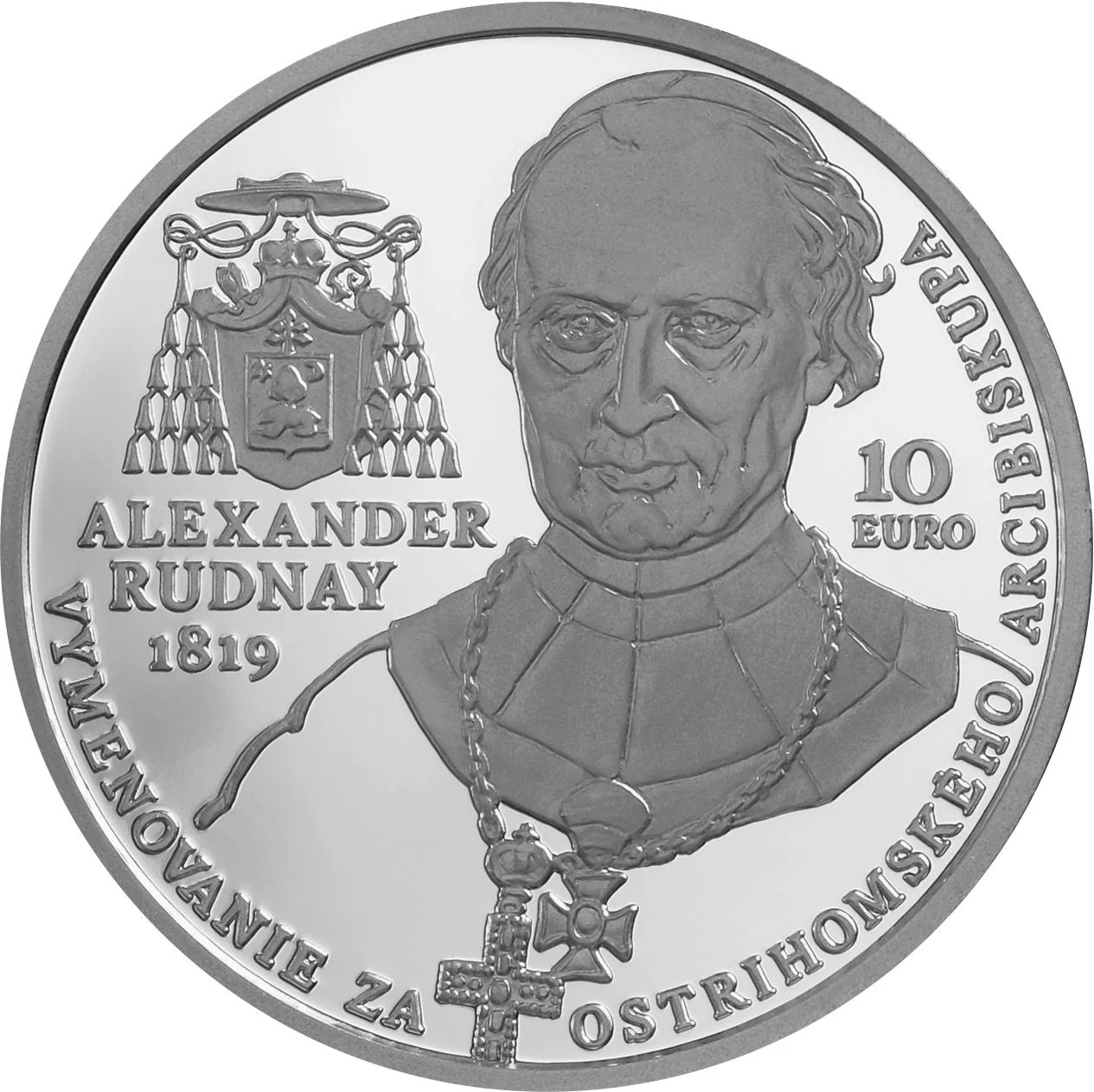 The reverse features a portrait of Cardinal Rudnay, with his coat of arms to the left. Below the arms are 'ALEXANDER', 'RUDNAY', and '1819'. To the right are '10' and 'EURO'. The inscription 'VYMENOVANIE ZA OSTRIHOMSKÉHO ARCIBISKUPA' arcs around the upper edge.