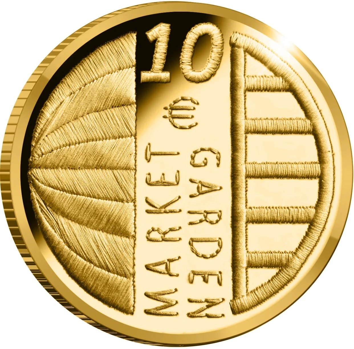 Embroidered badge with a parachute and bridge, divided by text and value, symbolizing the airborne invasion and Arnhem's Rhine bridge.