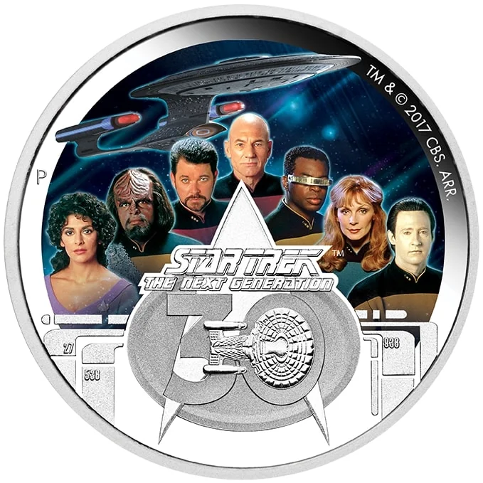 The Star Trek: The Next Generation 30th Anniversary logo with a color image of the U.S.S. Enterprise-D crew.