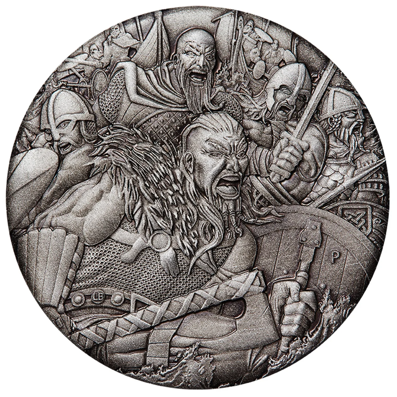 Viking warriors charging maniacally through water, roaring fearsomely in exquisitely detailed armor and weaponry.