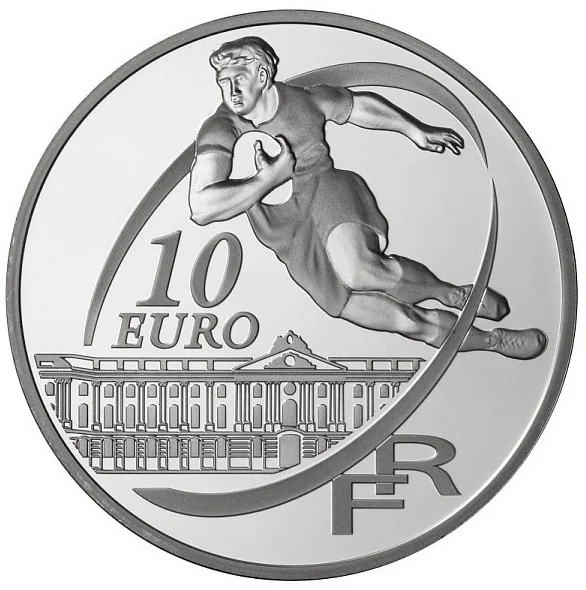 A rugby player runs through an oval frame that encircles the Capitol of Toulouse and the coin's face value.