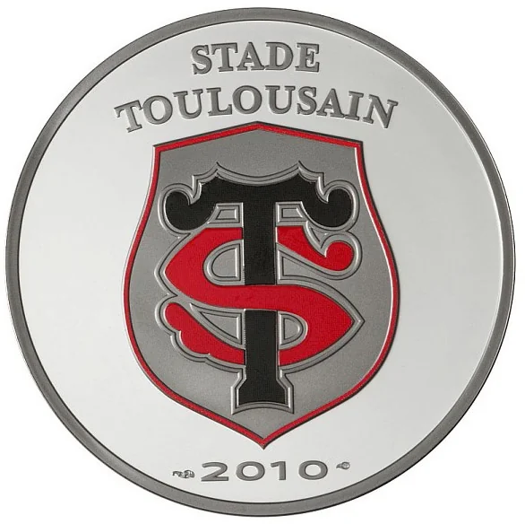On the coin's upper edge is "STADE TOULOUSAIN." Centered is the club's red and black crest on a silver field, above the year "2010" and the Paris mint mark.