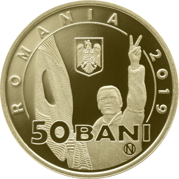 A young man holding the plain tricolor flag of the 1989 Romanian Revolution, making a victory sign. Included are the arched word "ROMANIA," the national coat of arms, "2019," the face value "50 BANI," and the collector coin mark "N" in a circle.
