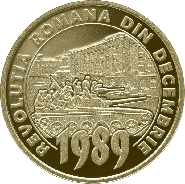 A snapshot of the 1989 Romanian Revolution with the circular inscription “REVOLUTIA ROMANA DIN DECEMBRIE” and the year “1989”.