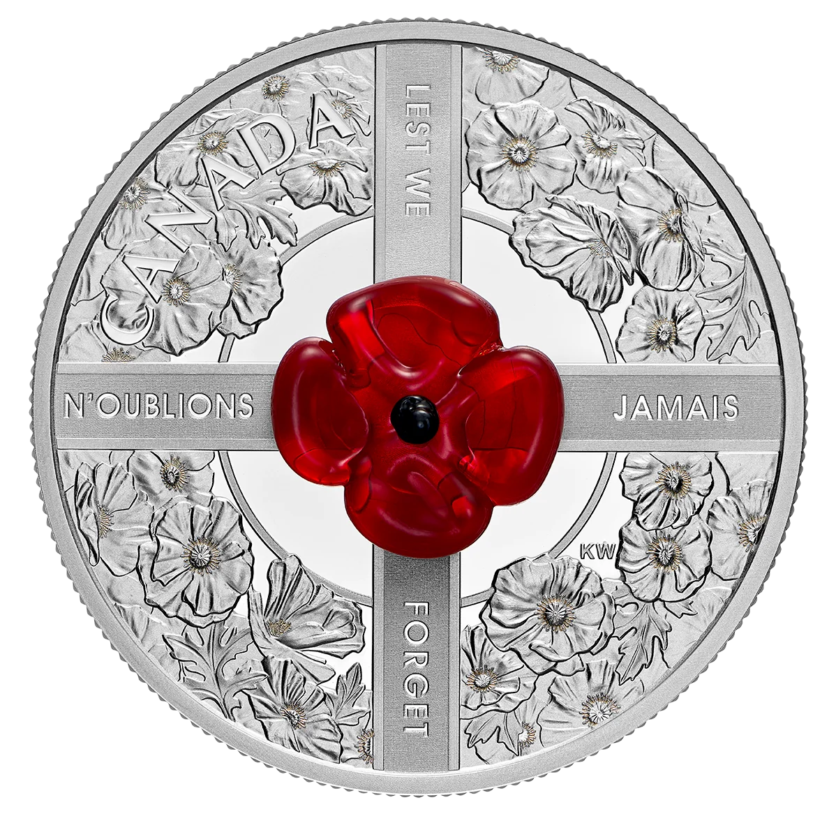 Designed by Kerri Weller, this coin features a central red Murano glass poppy set against a proof finish, encircled by a wreath symbolizing continuity and hope. The design is based on Remembrance Day wreaths, with a cross-shaped ribbon bearing the text “LEST WE FORGET N’OUBLIONS JAMAIS”.
