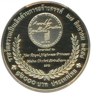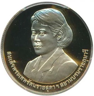 Description: Bust of Princess Maha Chakri Sirindhorn in plainclothes, facing half-left. She wears a commemorative brooch on her left chest, with inscriptions below.