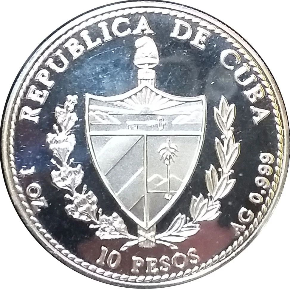 Cuban coat of arms with curved country name above, face value below, weight and fineness on sides, rope edge design.