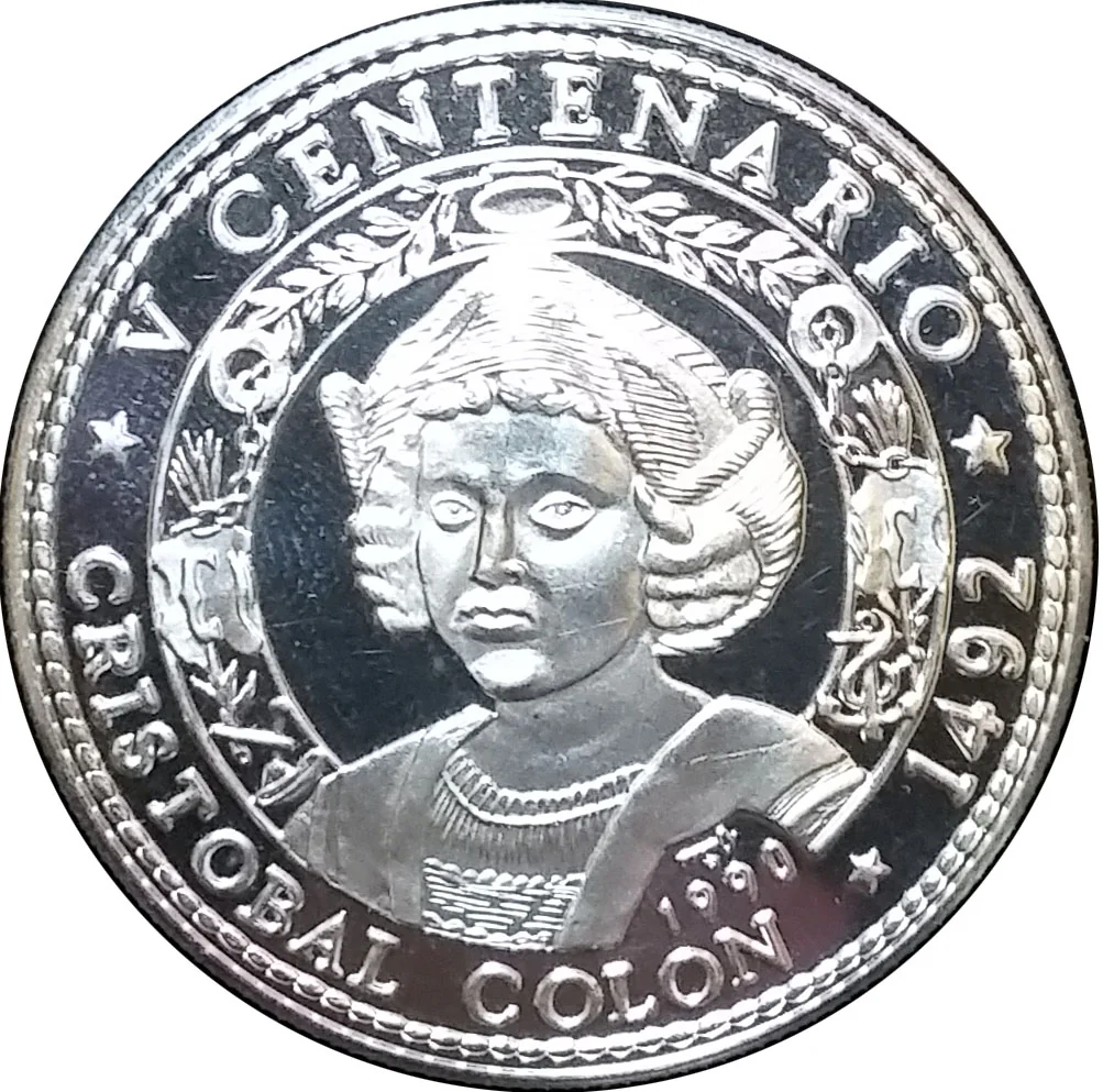 Bust of Columbus with olive wreath and naval items. Name below; event and date above and right. Mintmark and issue date at bottom, encircled by a double rope border.