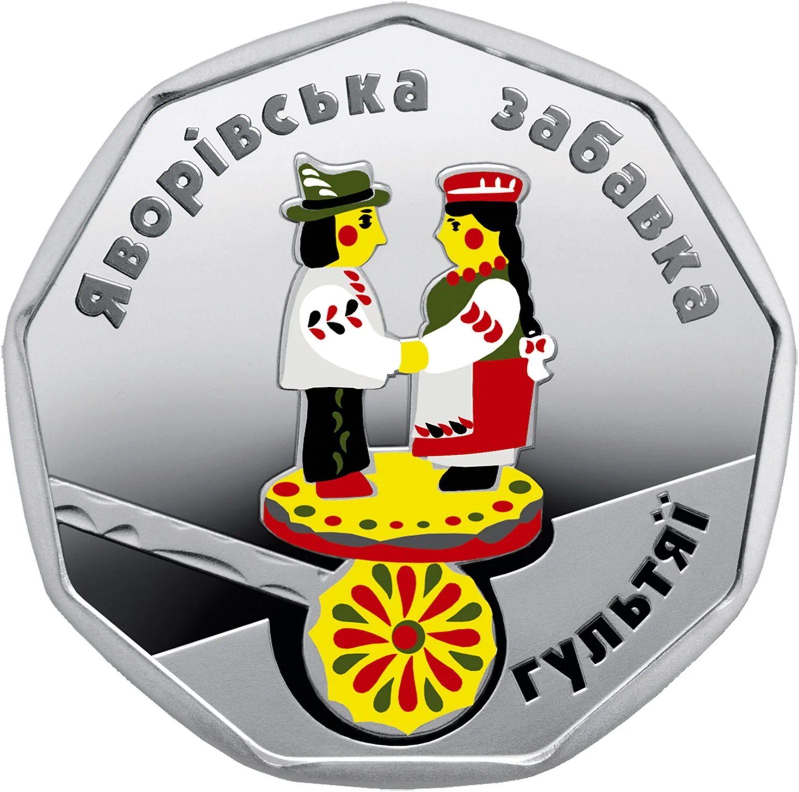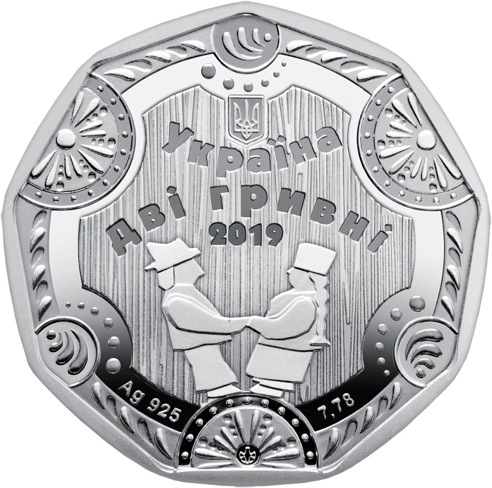 Description: Ukraine’s small coat of arms, framed by stylized Yavoriv motifs, appears above a Yavoriv toy walking couple. The inscriptions read УКРАЇНА/ДВІ ГРИВНІ/2019, with Ag 925 and 7.78 to the lower left and right, alongside the NBU mint mark.