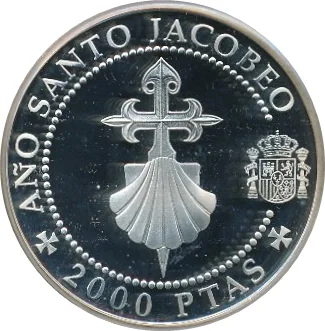 Santiago cross and scallop shell with Spain's crowned coat of arms to the right.