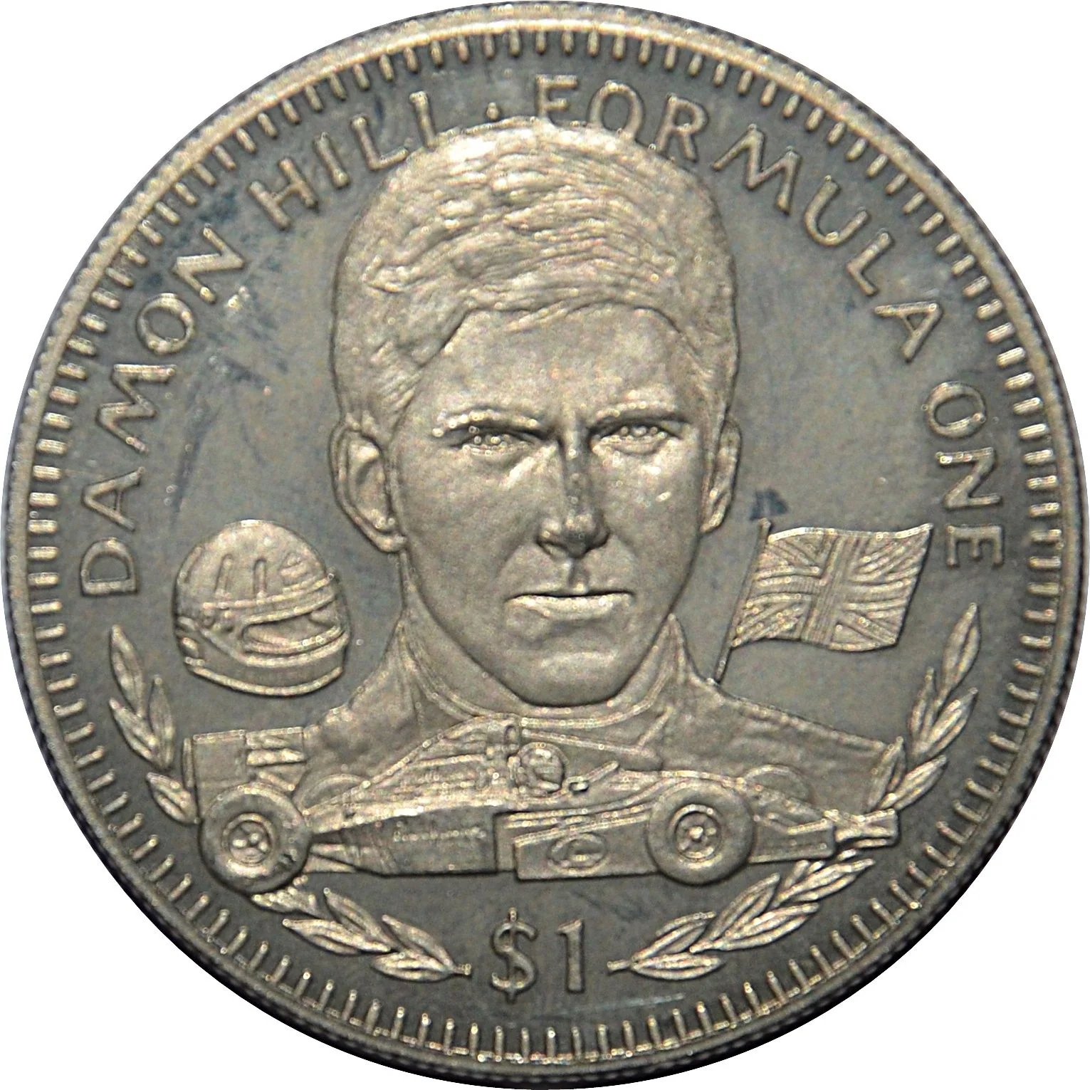 Damon Hill bust facing forward, with helmet, flag, car, and sprig-framed value.