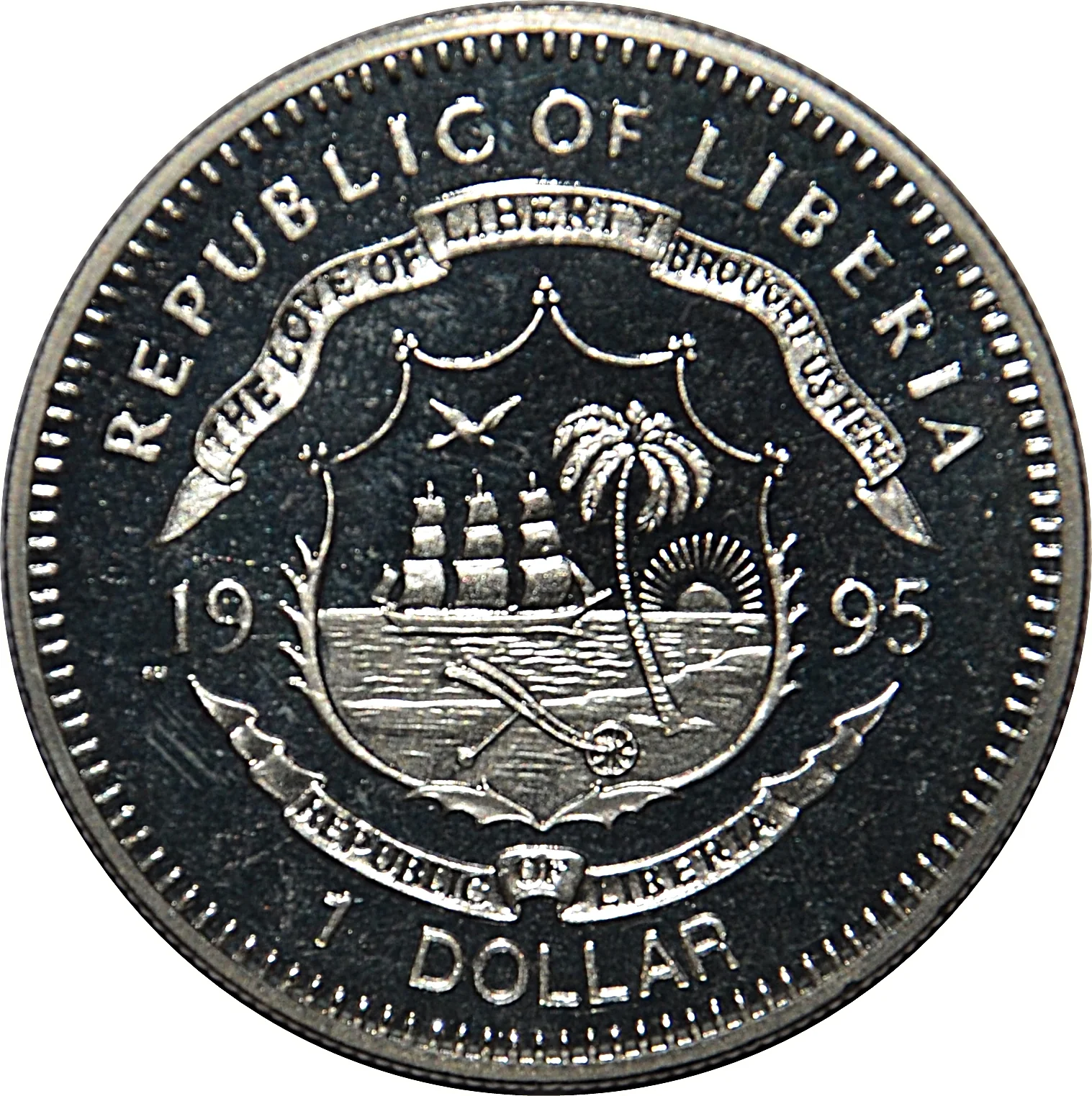 Liberian coat of arms divides date, denomination below.