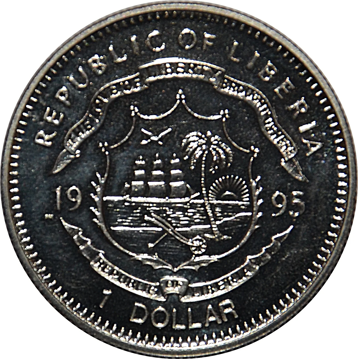 Liberian coat of arms divides date, denomination below.