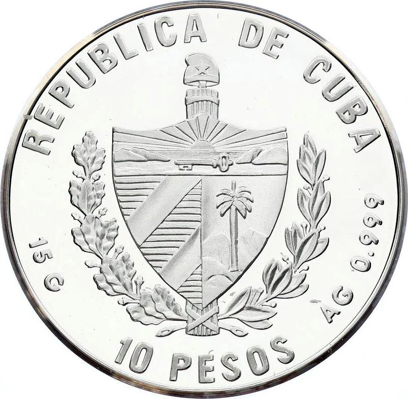Cuban coat of arms with country name above, face value below, and weight/fineness on the sides.