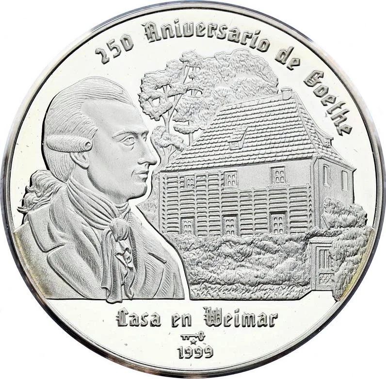 Goethe's bust facing right, above his Weimar home. Series name above, event name, mintmark, and year below.