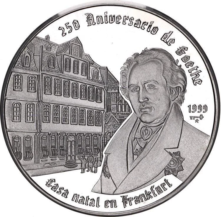 Goethe's birthplace, left-facing bust. Series above, event below, mintmark and year on right.