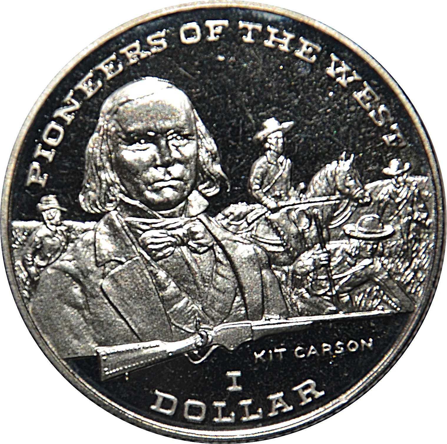 Front-facing bust of Kit Carson with a rifle below and cowboys on horseback behind.