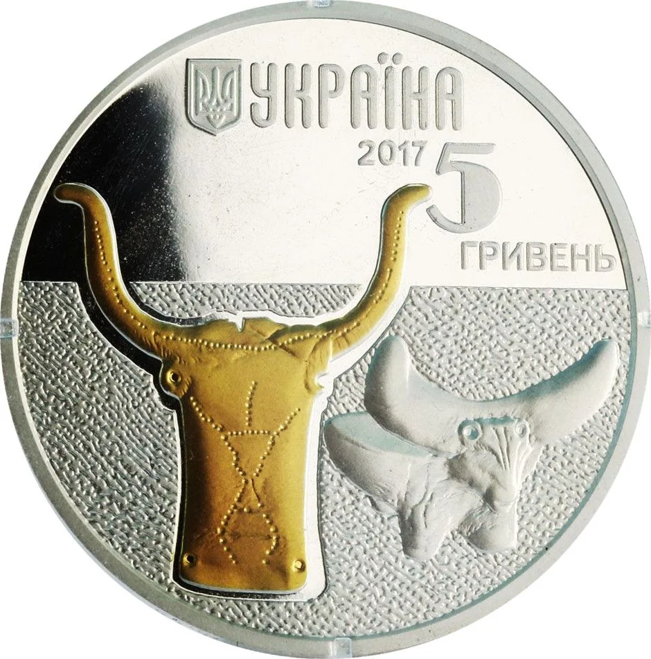 Ukraine's small coat of arms, "УКРАЇНА," the year 2017, and the face value 5 гривень are shown above. Below are Trypillian culture artifacts: a gilt auroch-head bone plate (Ternopil, 3700–3500 B.C.) at the center, with a ritual vessel featuring an auroch's head to its right.