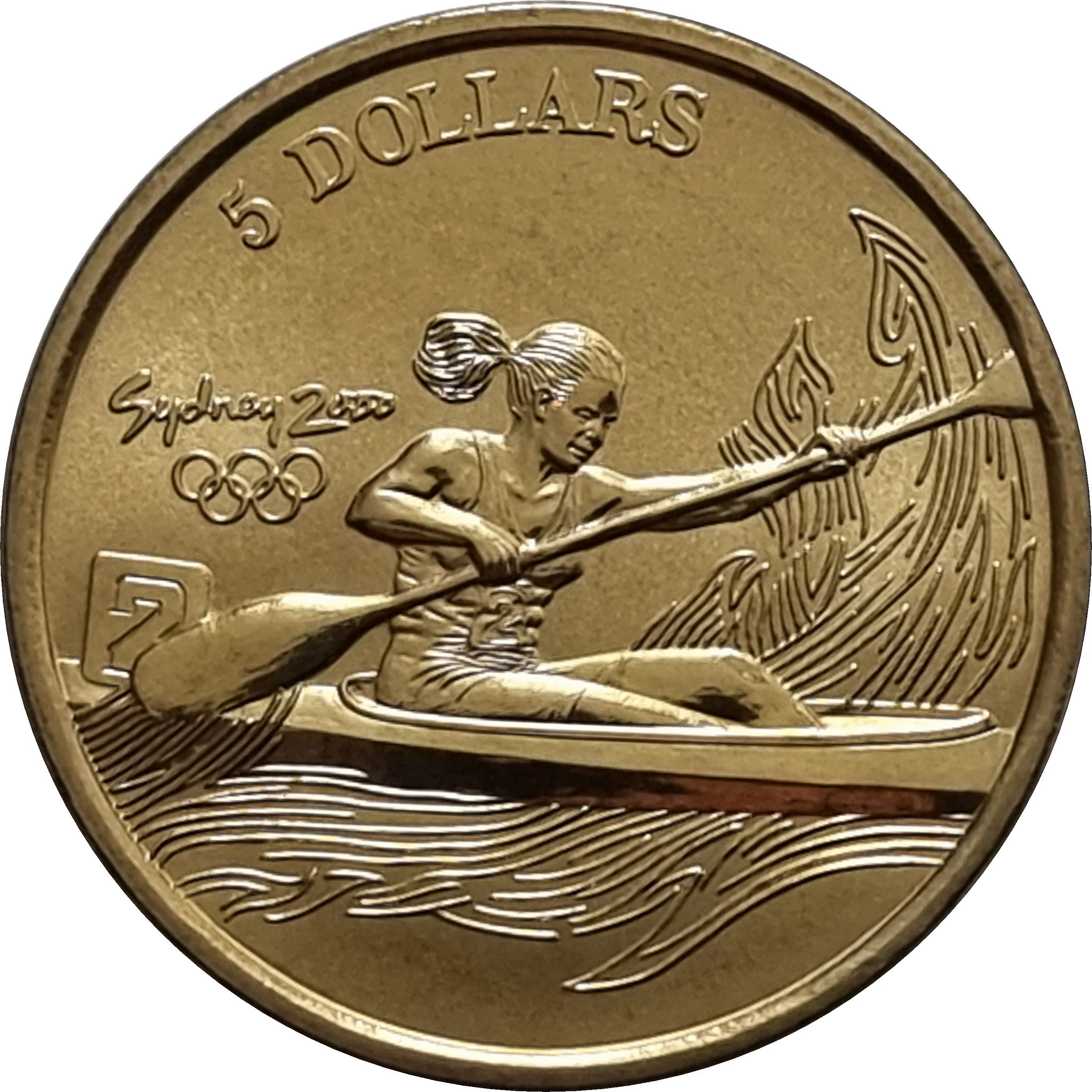A canoe/kayak racer paddles through waves, with the Sydney 2000 logo and small Olympic Rings at left.
