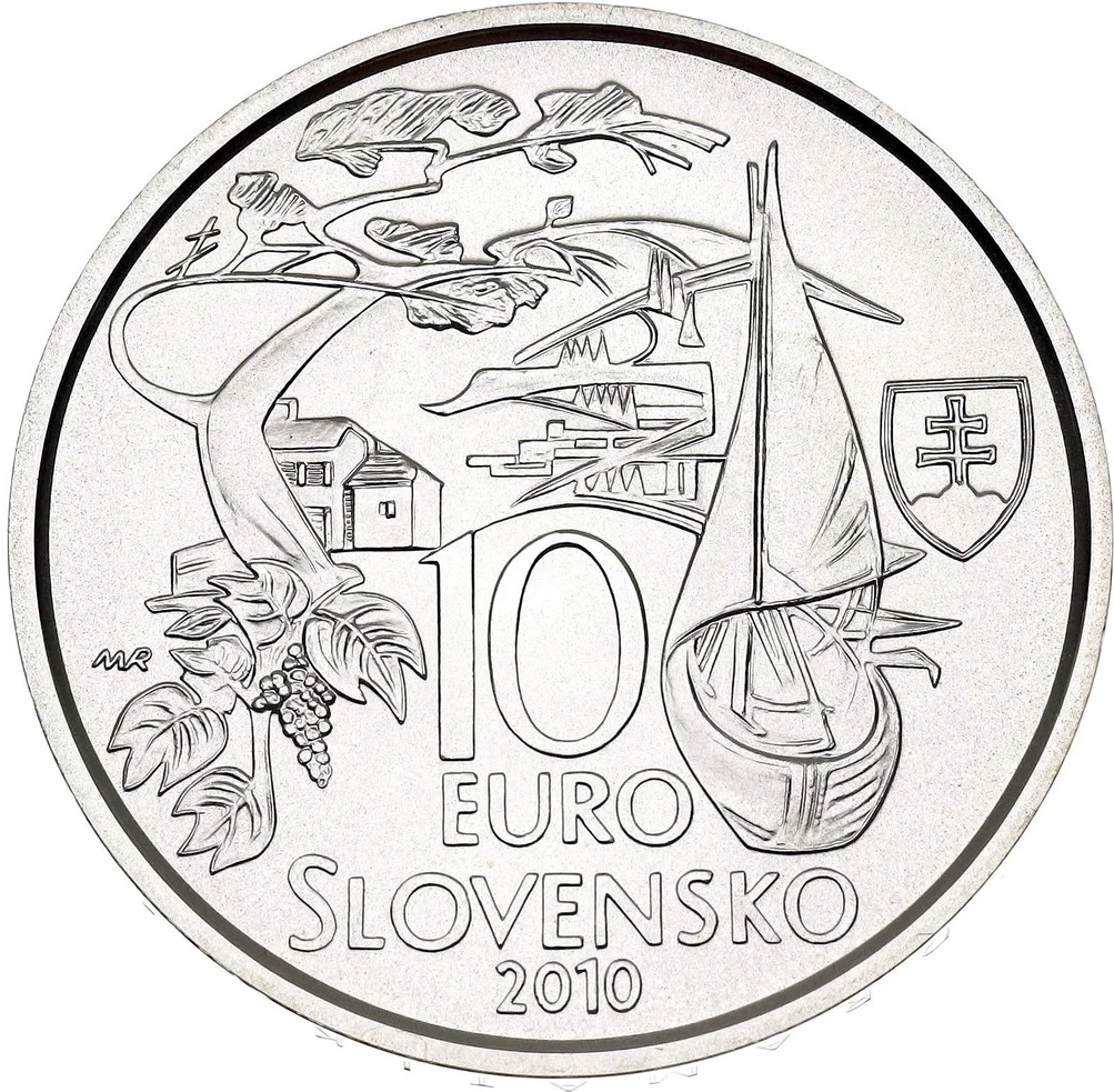 Designed by Miroslav Rónai, the reverse depicts a lake with a boat, houses, an olive tree, and the issuing state's coat of arms on the left.