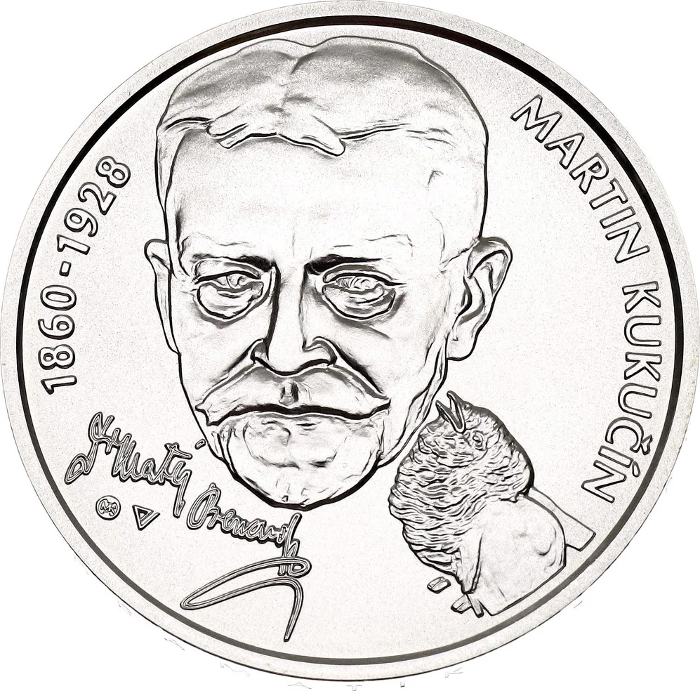 The obverse, by Peter Valach, features the writer's portrait beside a cuckoo clock—referencing his pseudonym—with his signature below and his name and dates near the listel.
