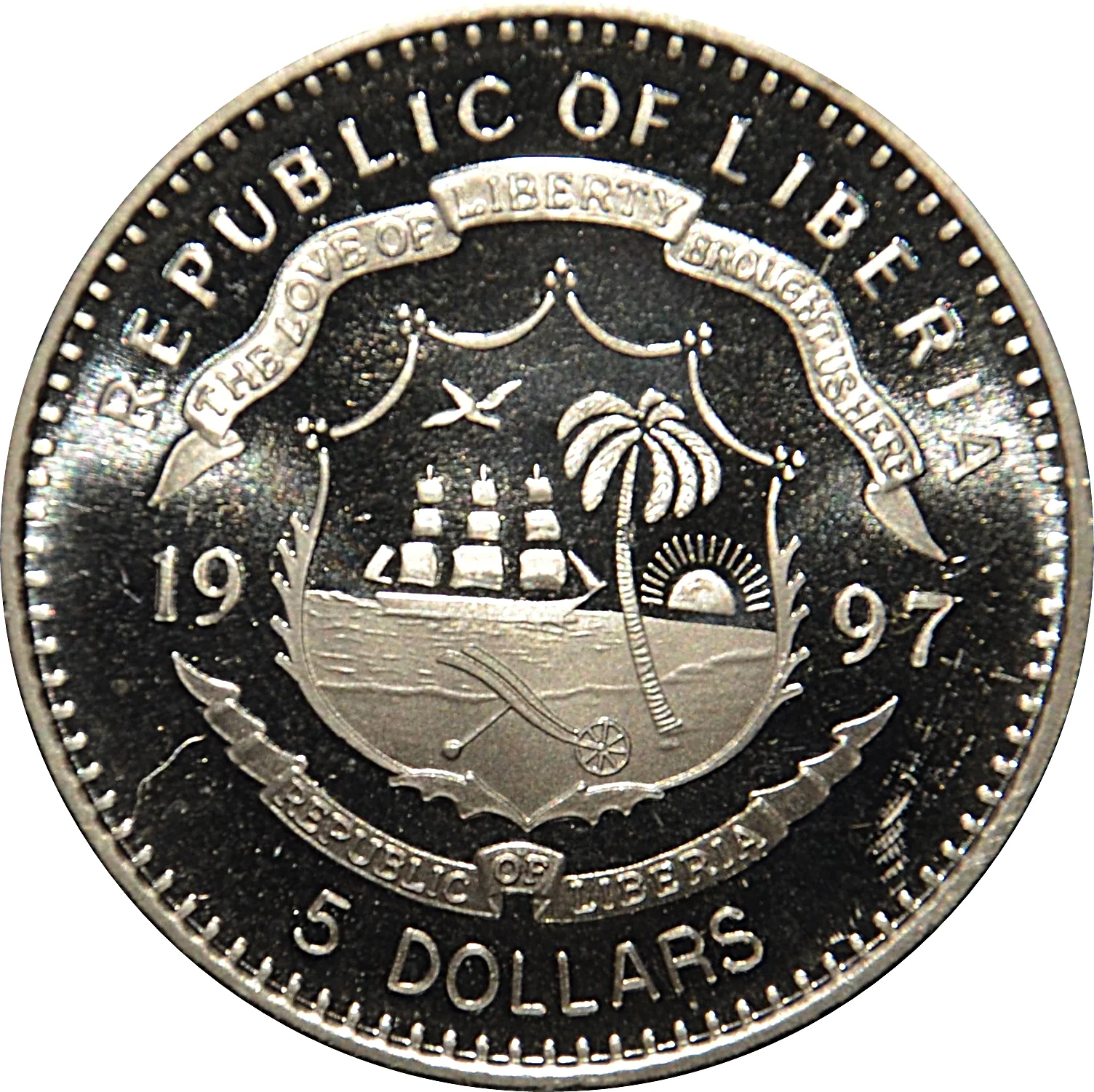 Coat of Arms of Liberia divides date, denomination beneath.