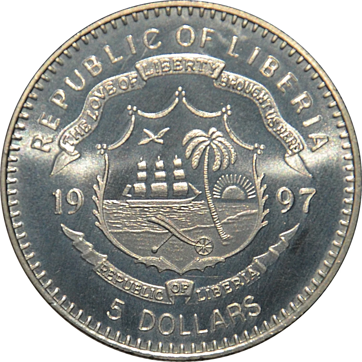 Coat of Arms of Liberia divides date, denomination beneath.
