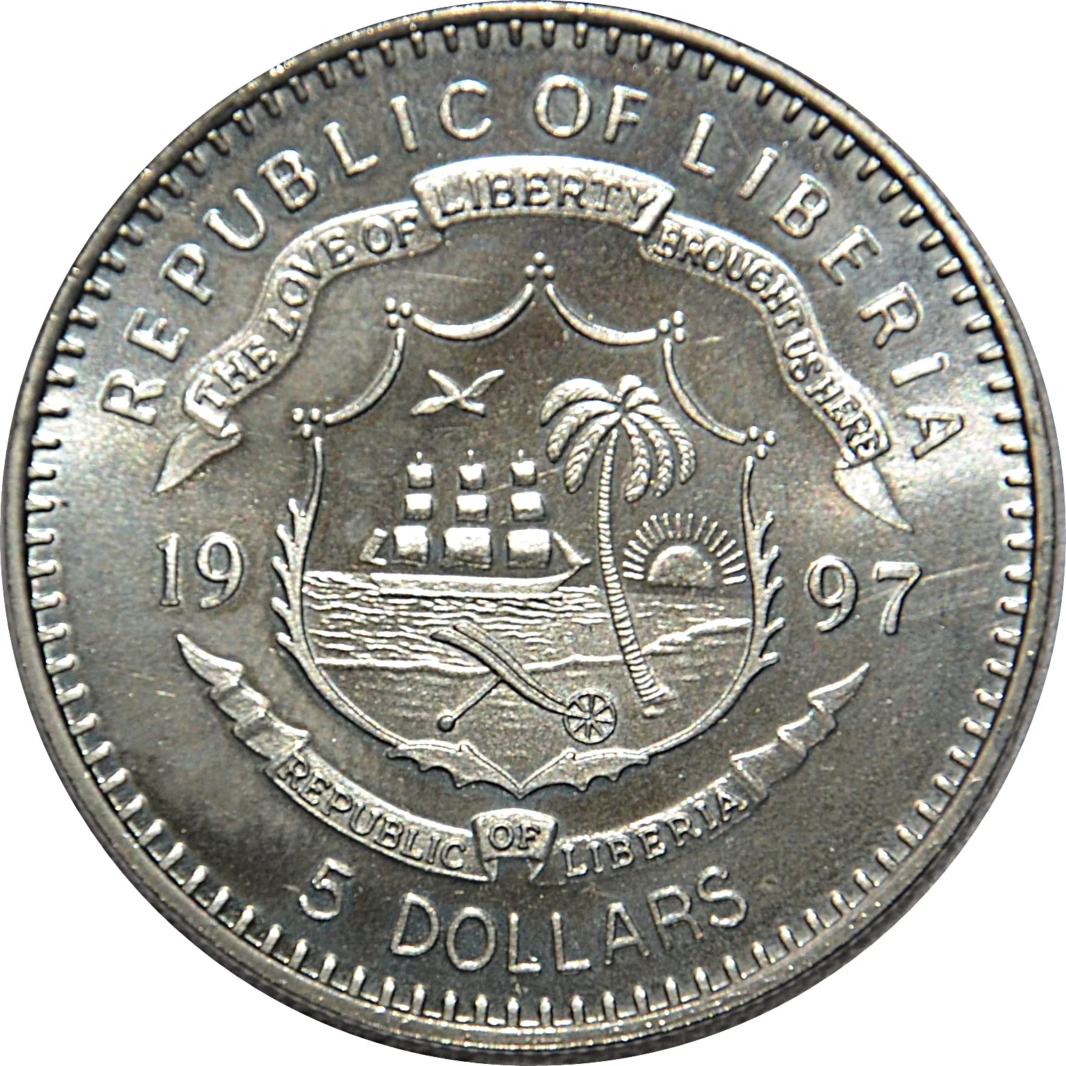 Liberian coat of arms divides date, denomination below.