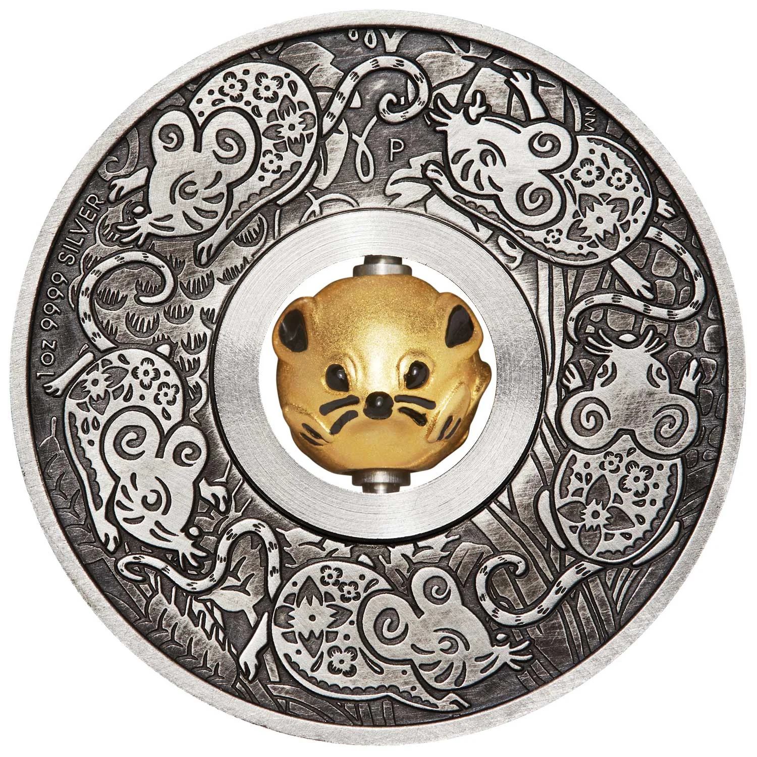 Stylized mice with harvest symbols of wheat, grapes, and corn, representing abundance in Chinese culture. The sterling silver coin features a central, rotating mouse-shaped bead plated in 18-karat gold.