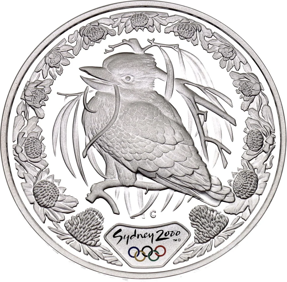 Kookaburra with a worm, encircled by floral wreath. Olympic logo below.