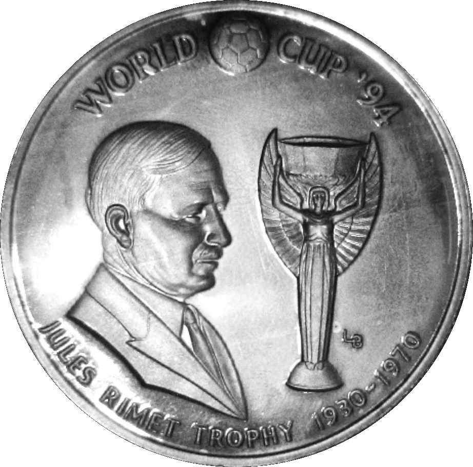 Jules Rimet bust facing right beside the World Cup trophy that bears his name.