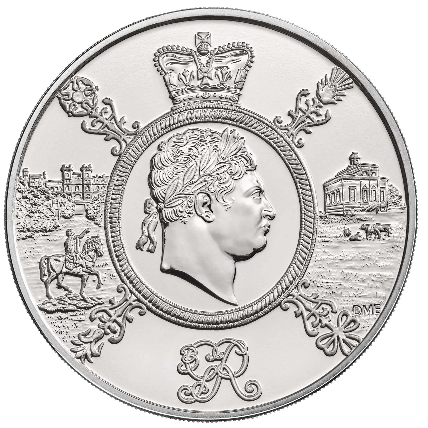 George III's "bull head" portrait at the coin's center, encircled by the symbols of his kingdoms and framed by his crown.