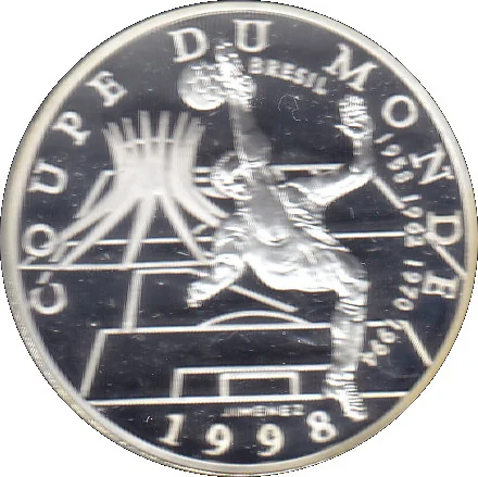 Sunrise football over Earth / Central "FRANCE 98" / Value below / Right "RF" / Year in outer ring.