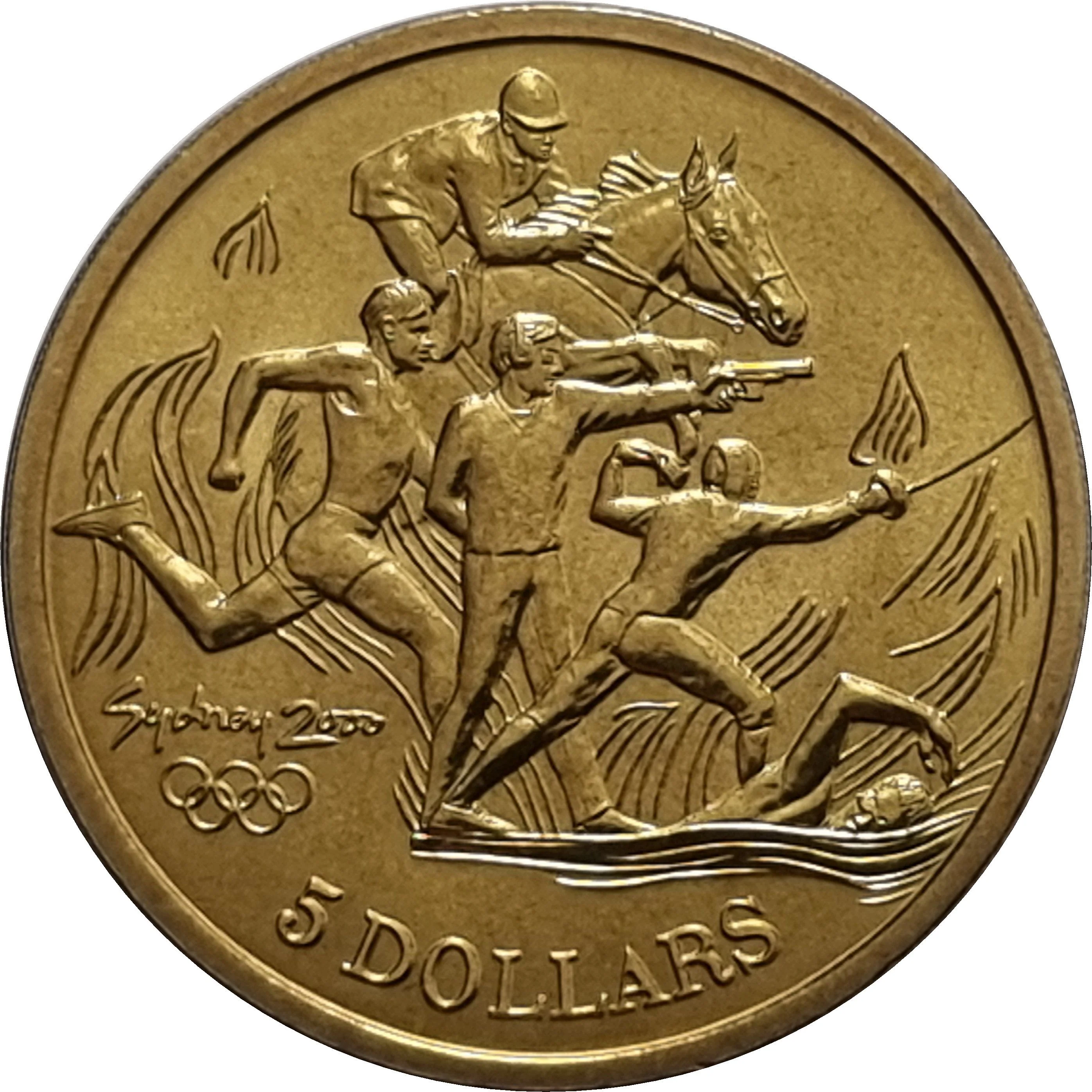Modern Pentathlon's five sports: fencing, swimming, shooting, running, and riding. Features small Olympic rings and the Sydney 2000 logo.