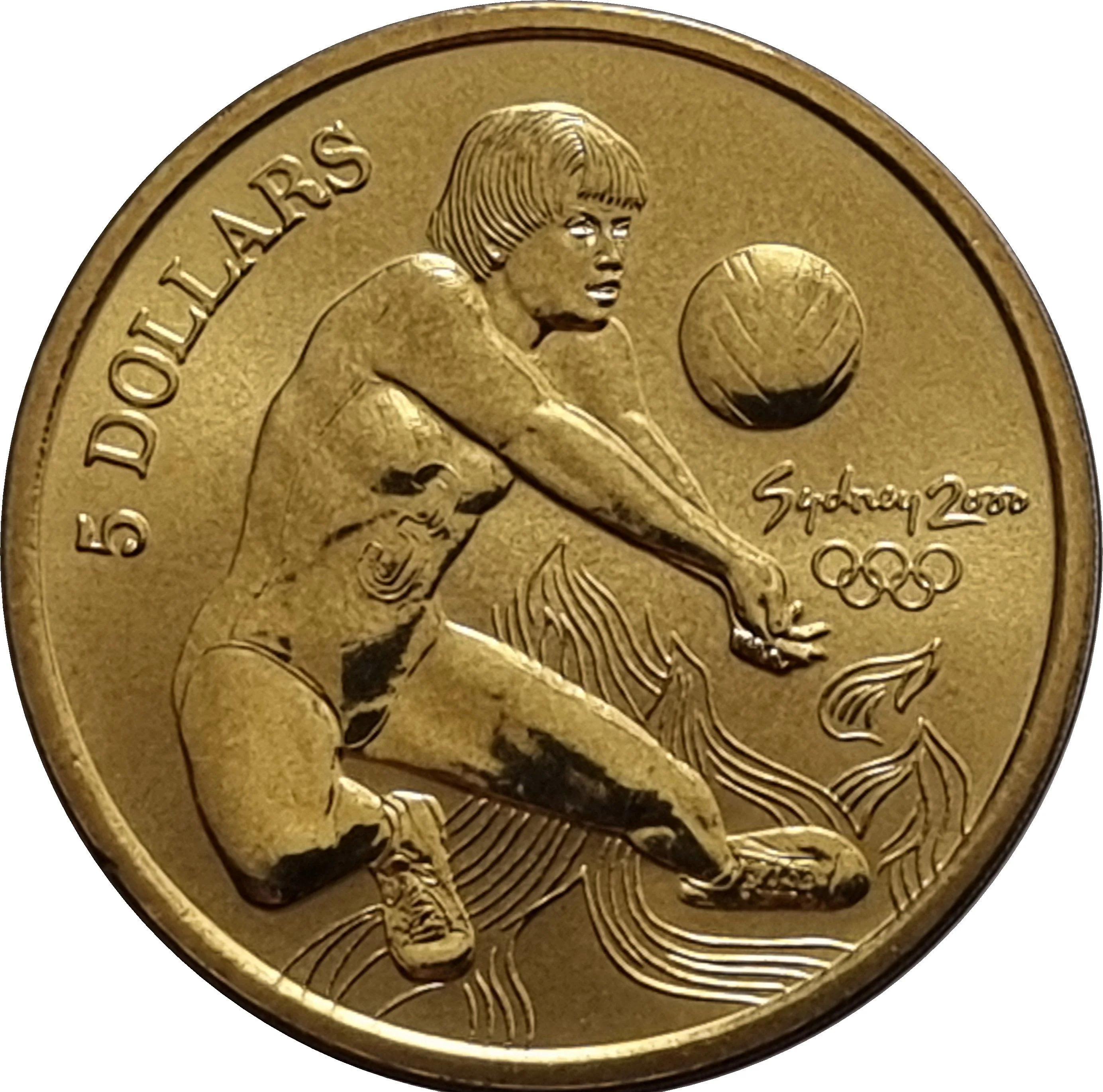 A volleyball player hitting the ball. Small Olympic rings under the Sydney 2000 logo.