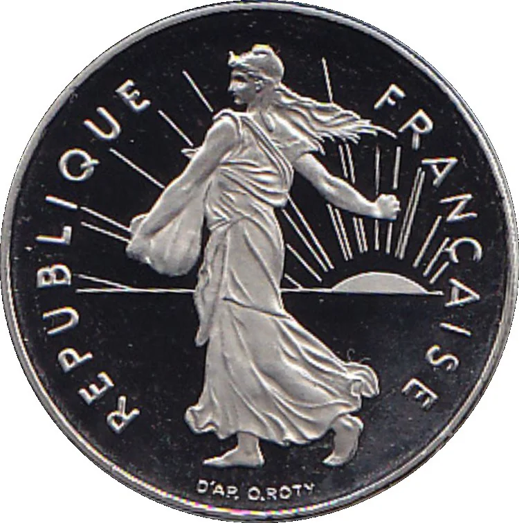 Olive and oak branches, wheat, a flower, and a poppy bud surround the face value, encircled by the motto "LIBERTE - EGALITE - FRATERNITE".