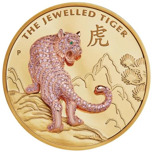 A rose gold tiger set with 328 Argyle pink diamonds and Muzo emerald eyes.
