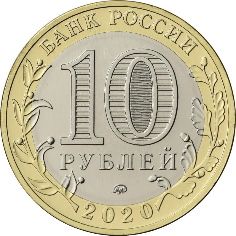 The obverse features "БАНК РОССИИ" (BANK OF RUSSIA) above and "2020" below. Stylized laurel and oak branches flank the outer ring, extending onto the disc. The central disc shows the face value "10 РУБЛЕЙ" (ROUBLES), with a hidden "10 РУБ" (RUB) inside the zero visible at different angles. The Moscow mint mark is at the disc's bottom.