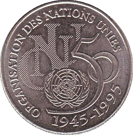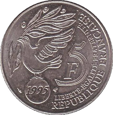 A dove with an olive branch perched on a globe, symbolizing peace. Face value and year. Inscribed: "RÉPUBLIQUE FRANÇAISE" and "LIBERTÉ-ÉGALITÉ-FRATERNITÉ".