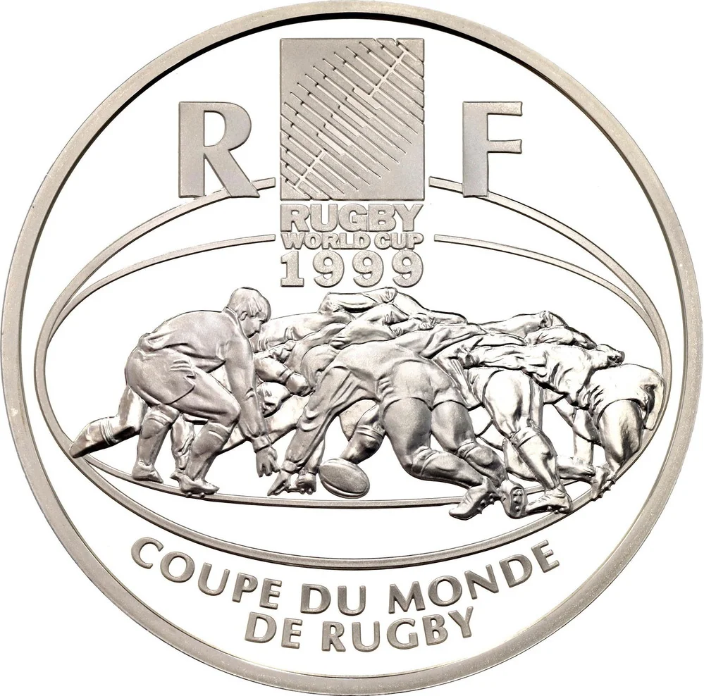 "WORLD CUP OF RUGBY" around the rim. "RUGBY WORLD CUP 1999" above the central logo, which depicts a scrum within a stylized ball.