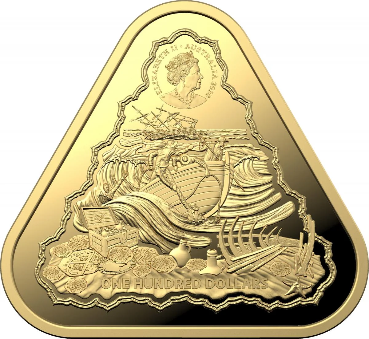 Queen Elizabeth VI in profile with crown and necklace. Below, a shipwreck with a lifeboat, then a chest spilling gold coins.