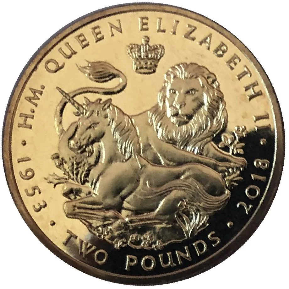 A crown above a lion and unicorn resting among UK national plants, with the value below between 1953 and 2018.