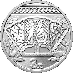 The reverse features a Chinese "fu" character integrated with a traditional wall, window, flowers, auspicious clouds, and the face value.